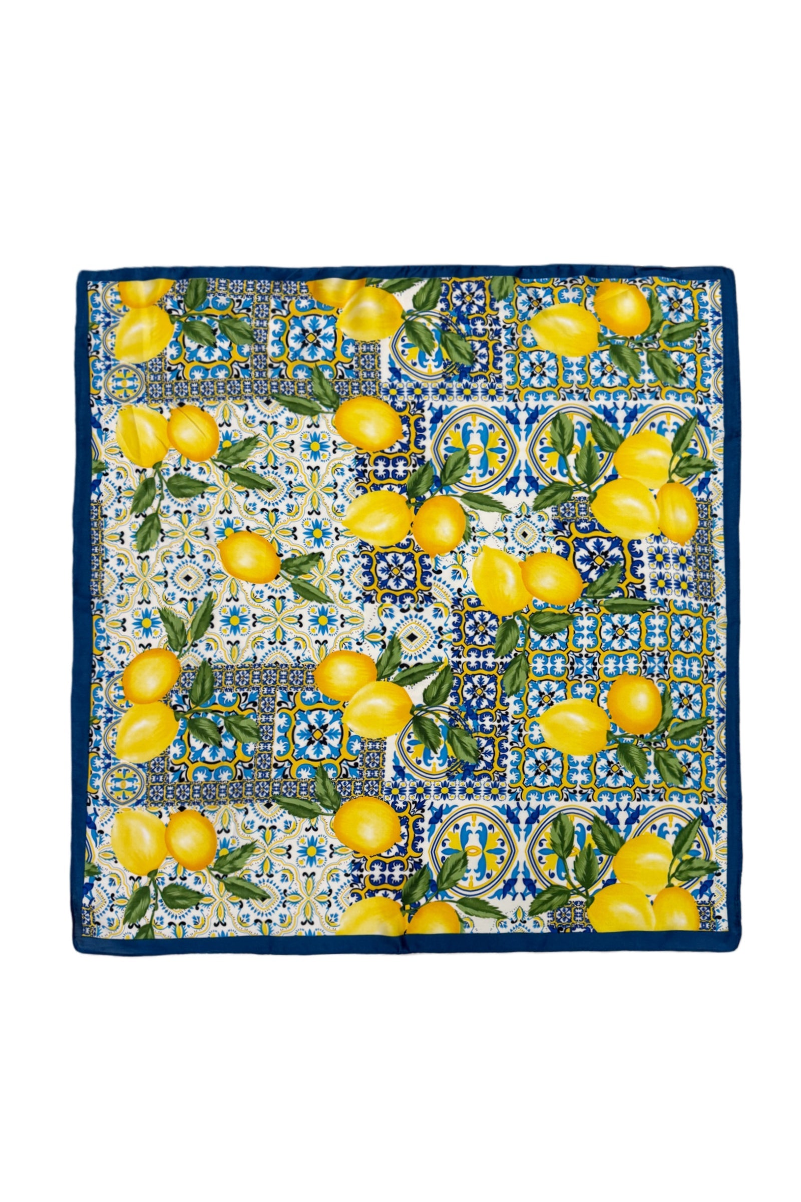 Add a vibrant Mediterranean touch to your outfit with this beautifully printed lemon tile neck scarf. Inspired by classic Italian ceramic patterns, the design features bright lemons set against intricate tile motifs for a fresh, summery feel.
